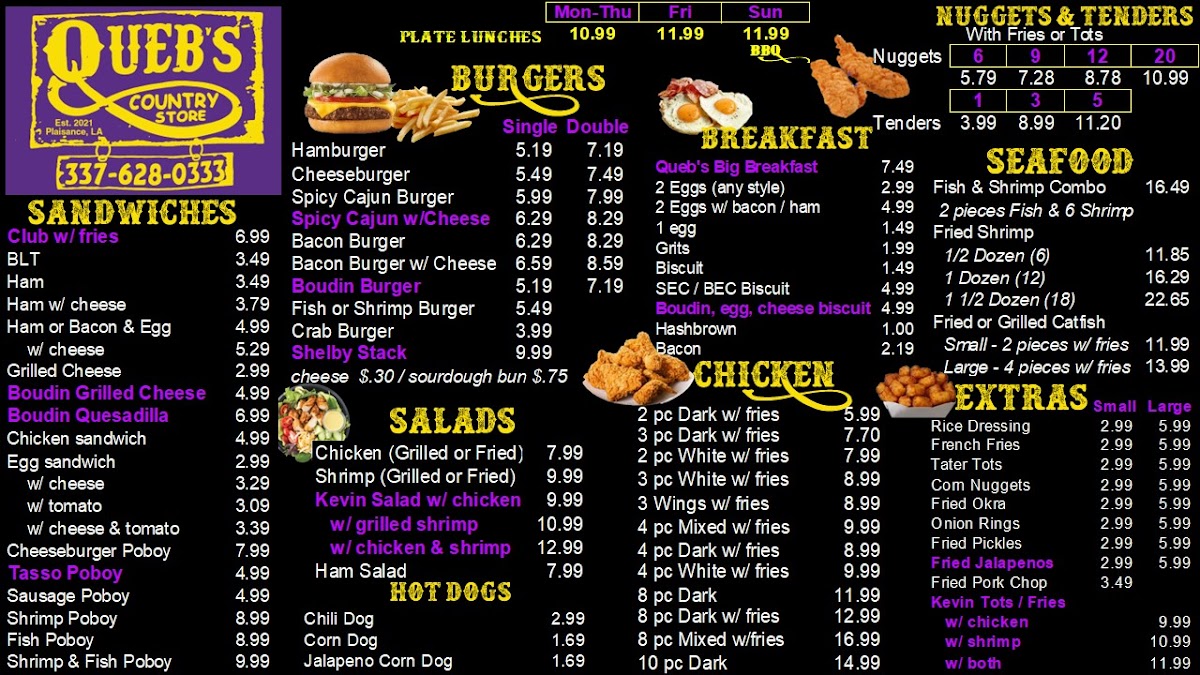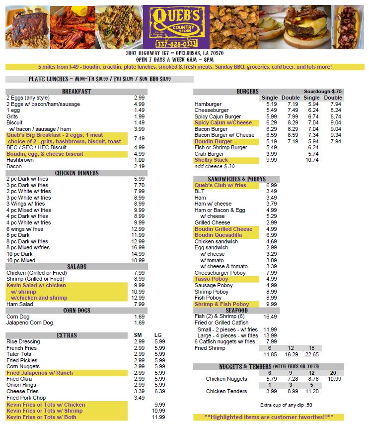 At Queb's Country Store Menu, you'll discover a delightful blend of Southern comfort food and local flavors. Located in the heart of Opelousas, LA, this charming spot offers a menu that showcases the best of homemade dishes, perfect for satisfying any craving. From hearty breakfast options to savory lunch and dinner choices, the variety is sure to please every palate. Whether you're in the mood for a classic po'boy sandwich, a hearty plate of jambalaya, or something sweet like homemade pie, Queb's has you covered. The menu is a true reflection of the warmth and hospitality of the South, offering dishes made from fresh, locally sourced ingredients. Each bite feels like a taste of home, making it a must-visit for anyone in the area looking to enjoy delicious, down-home cooking in a cozy, welcoming atmosphere.